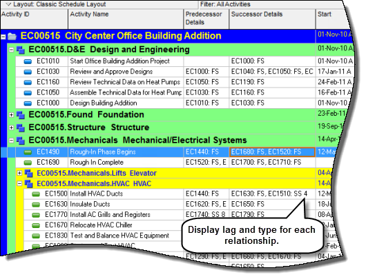 P6 Professional 16.1 enables you to view lag and relationship type data in the Activity Table in the Activities window. Two columns — Predecessor Details and Successor Details — have been added to the Lists grouping in the Columns dialog box. These read-only columns display the Activity ID, relationship type, and lag of a predecessor or successor activity. This feature is useful if you need to quickly find activities that have relationship lag.